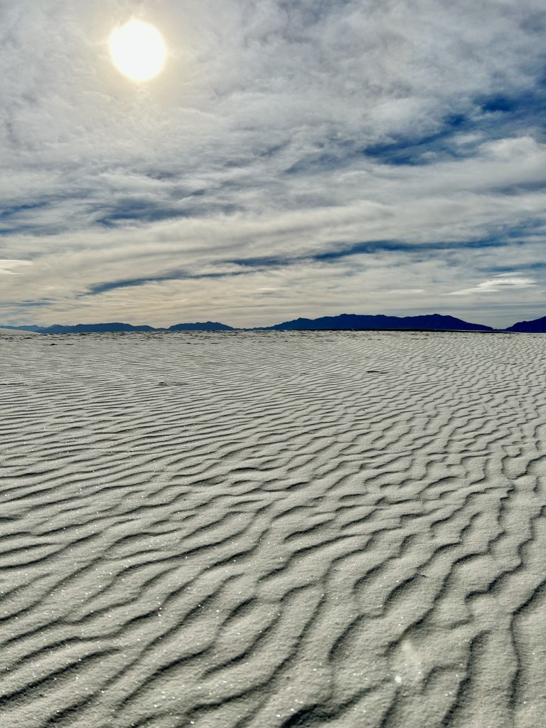 Science lesson! So the White Sands are actually gypsum crystals that were eroded down into sand. Four billion metric TONS of sand! The gypsum lived up in those mountains you see in the distance until the planet started warming after the Ice Age and it all melted down into the Tularosa Basin before getting blown and eroded by the wind even further away from the mountains. Today, the sand dunes span 275 square miles and are roughly 30-60 feet deep depending on the dunes. I couldn’t even wrap my head around how far beneath our feet the sand kept going.