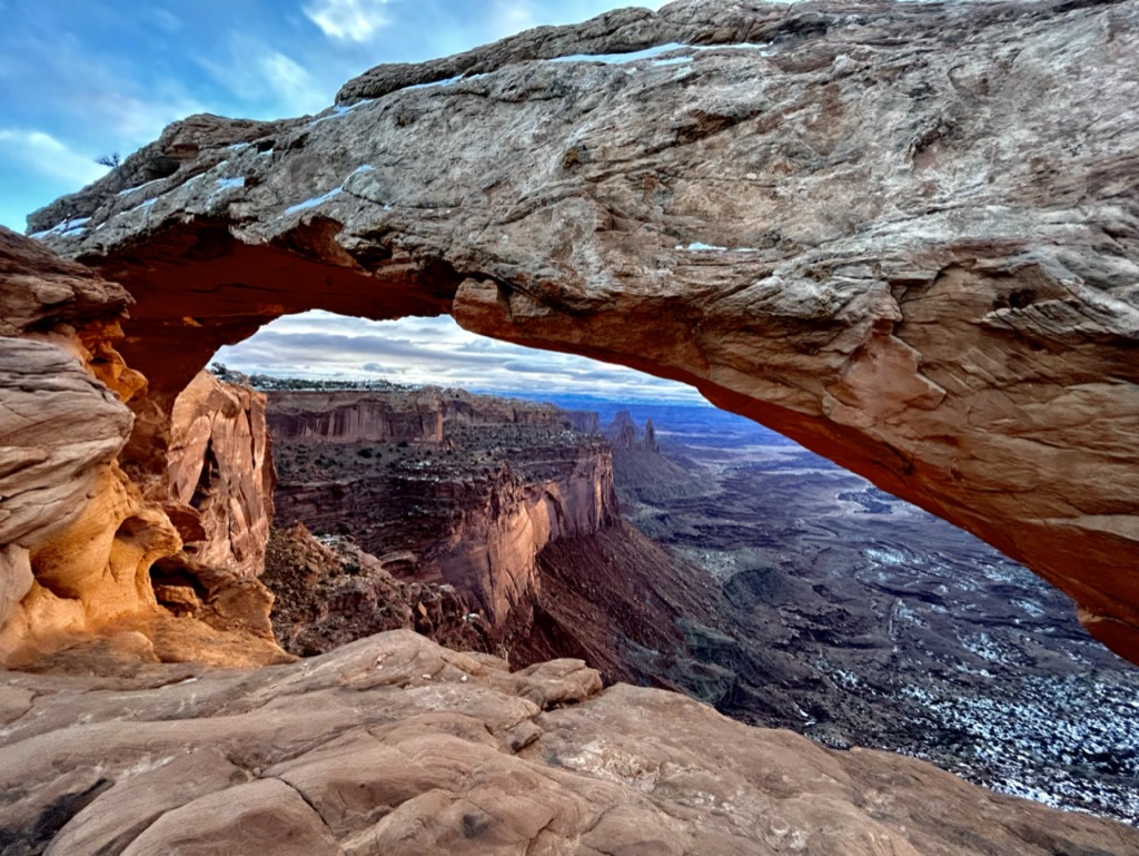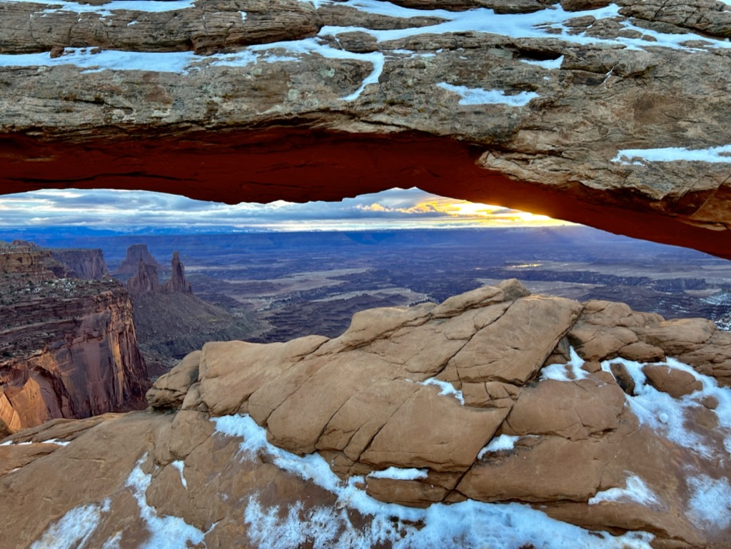 Mesa Arch is the most popular sunrise spot in the park and there were quite a few people there even before us. We were lucky that it had gotten so warm overnight because the parking lot was an ice trap when we drove by it the night before, but by the time we got there the next morning it had melted into a mostly manageable slush pile.