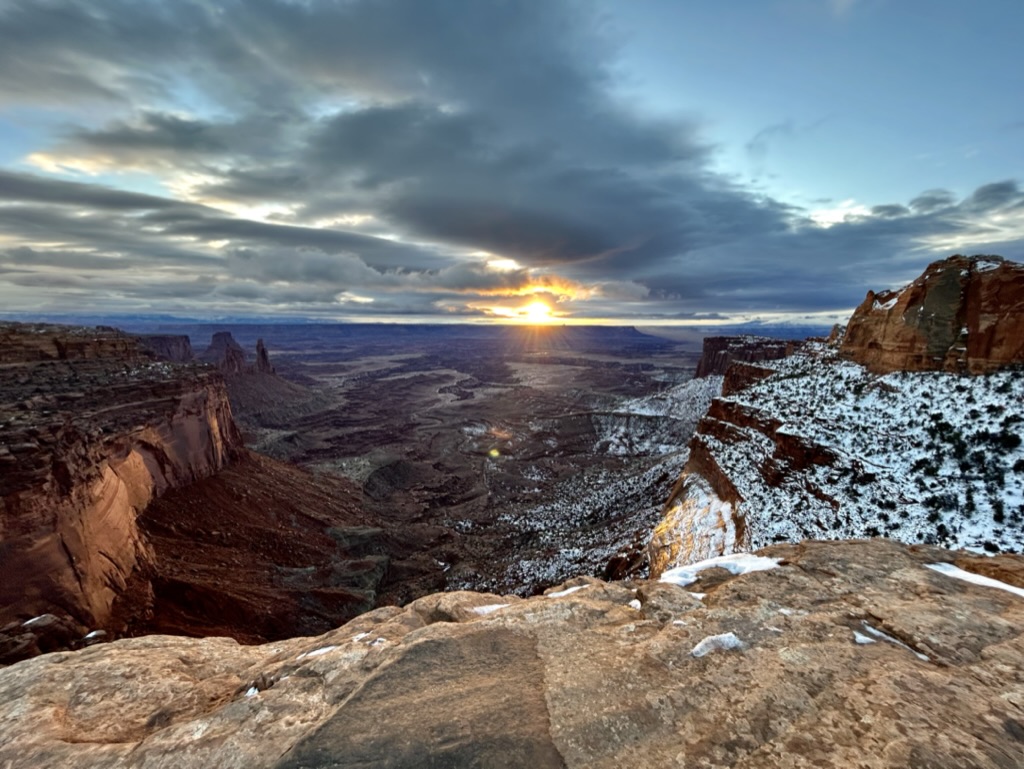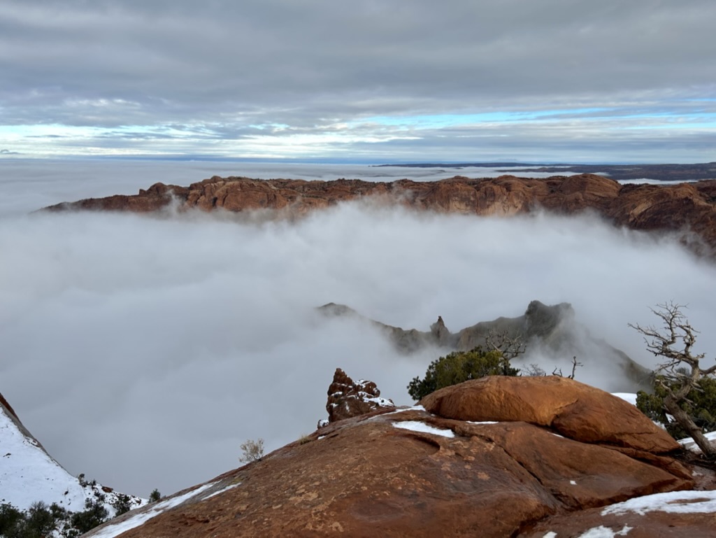 From the East side of the park near Shafer Trail you can see the La Sal Mountains (the same ones from Arches) in the distance. On this Western side of the park, you see the Abajo Mountains to the South. We were surrounded by beautiful snow-capped mountains in the distance, with dramatic canyons and cliffs in the foreground, and fog filling in all of the cracks in between. The layers of it all were truly mesmerizing.