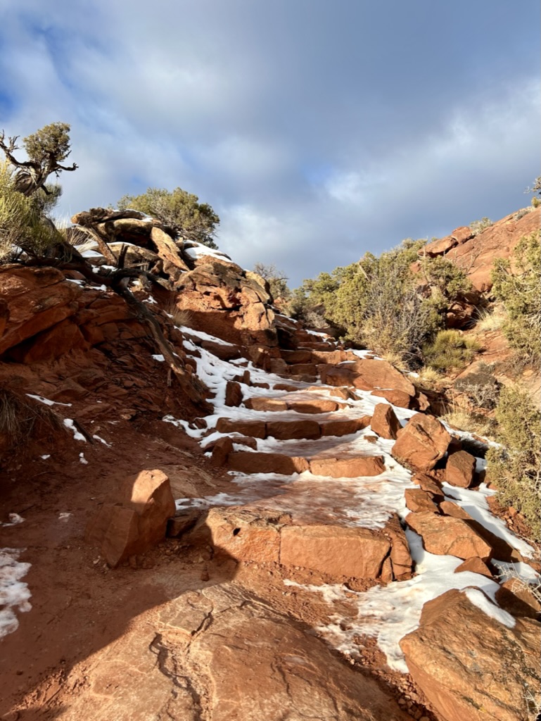 We ultimately decided to go to the Upheaval Dome trailhead so that we could check out all of the main roads. We were the only ones in the parking lot when we got there and we didn’t see a single other person the entire time we were there. We boiled some water at the picnic tables for some tea and oatmeal for breakfast, strapped on our SPIKES, and headed off on the trail.