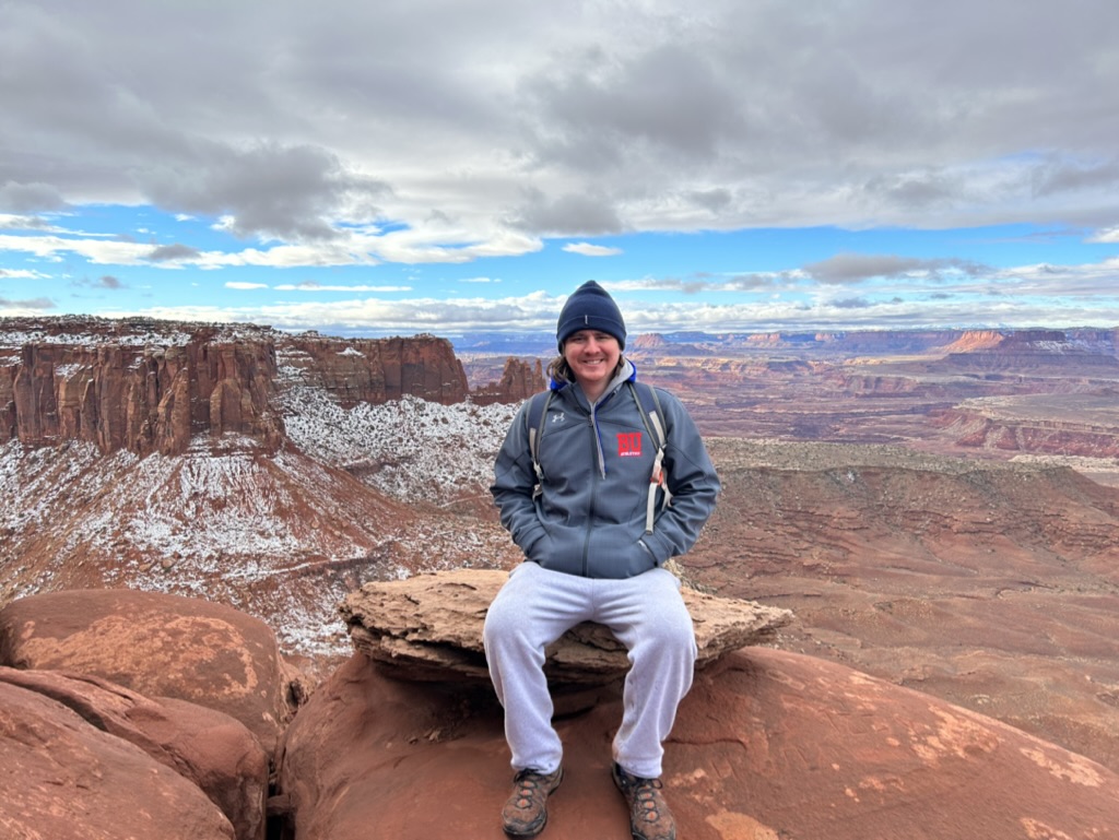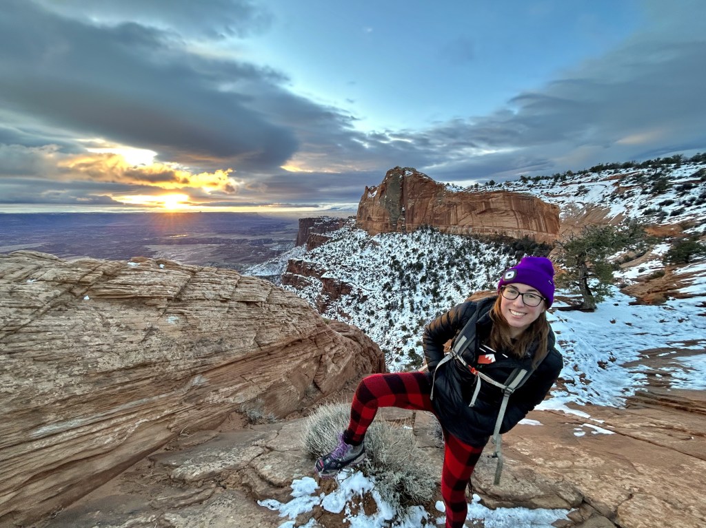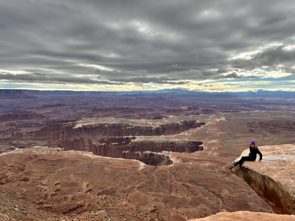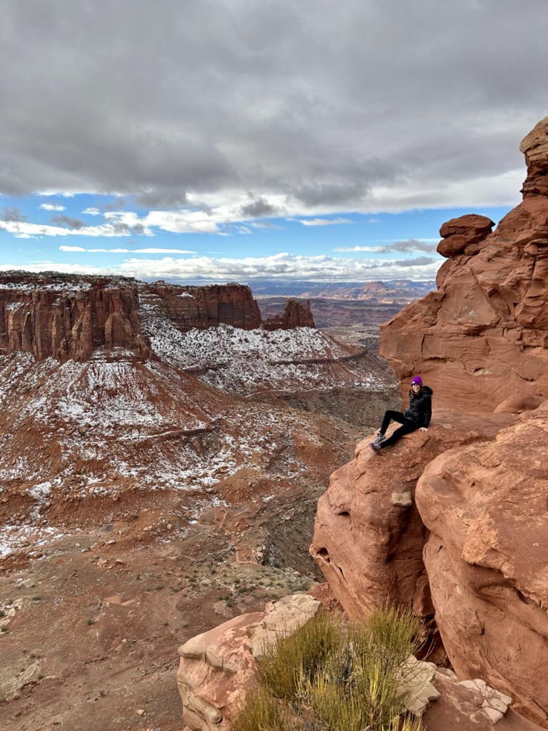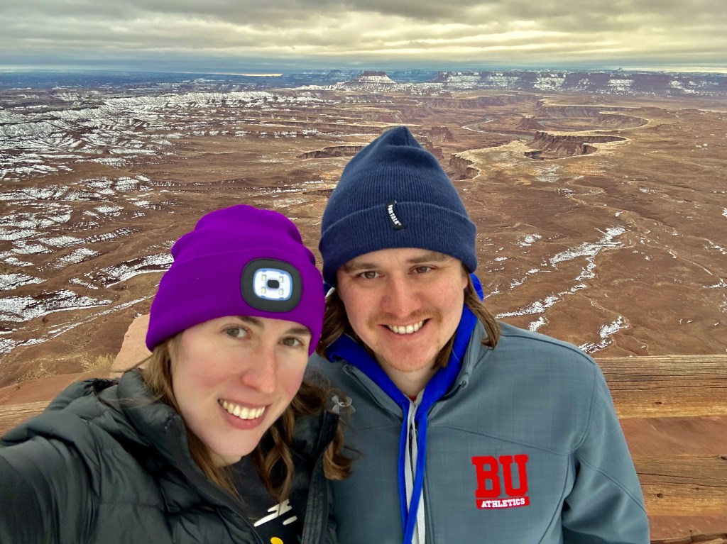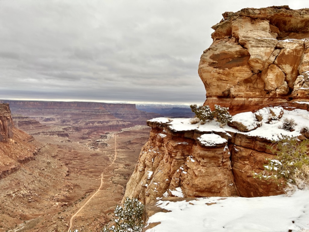 First up was this awesome Shafer Trail Overlook! That isn’t a hiking trail, it’s a road. Absolutely insane. Obviously you’re not supposed to go on it in winter and, even in the best conditions, you NEED a 4-wheel drive high clearance vehicle to drive on it. This Shafer Canyon Road brings you down to the White Rim floor, 1,200 feet down. (For context, that’s how far we hiked down into the Grand Canyon when we were there, only 20% of the way down.)