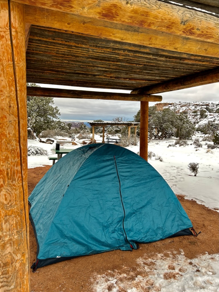 So, as you can see, these were really nice campsites. They even had these little shelters that are meant to protect you from the sun in the hot summer heat, but also worked wonders to protect the ground from the snow so we didn’t have to pitch our tent on top of several inches of snow. I was pretty pumped at this point. So remember when I said it snowed the night before at Arches and that would be relevant to a future story? Well congrats, this is that future story.