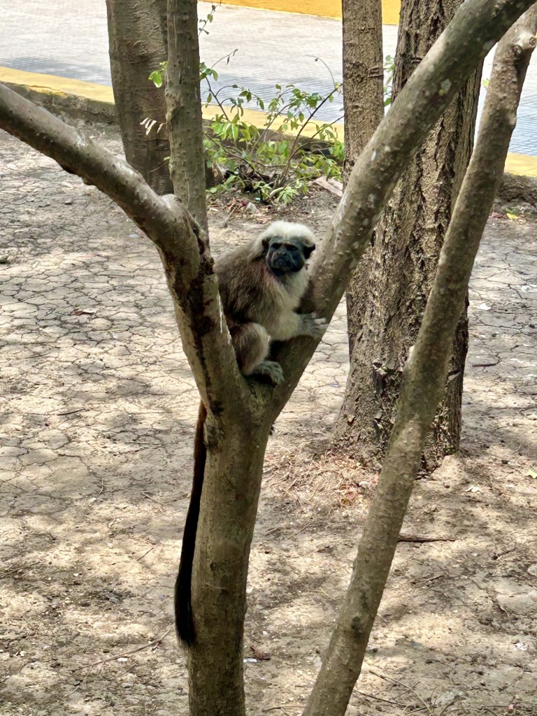 Now, in order to get from the walled city to Getsemani, you have to walk through the Parque del Centenario. I had heard that there were sloths living in this park and we’d probably have a pretty good chance of seeing them. This became my new mission. Unfortunately, I also knew there were a lot of monkeys in the park and for those who don’t know, I am TERRIFIED of monkeys. Luckily, my desire to see a sloth won out over my fears. Though, of course, guess who we ran into first?